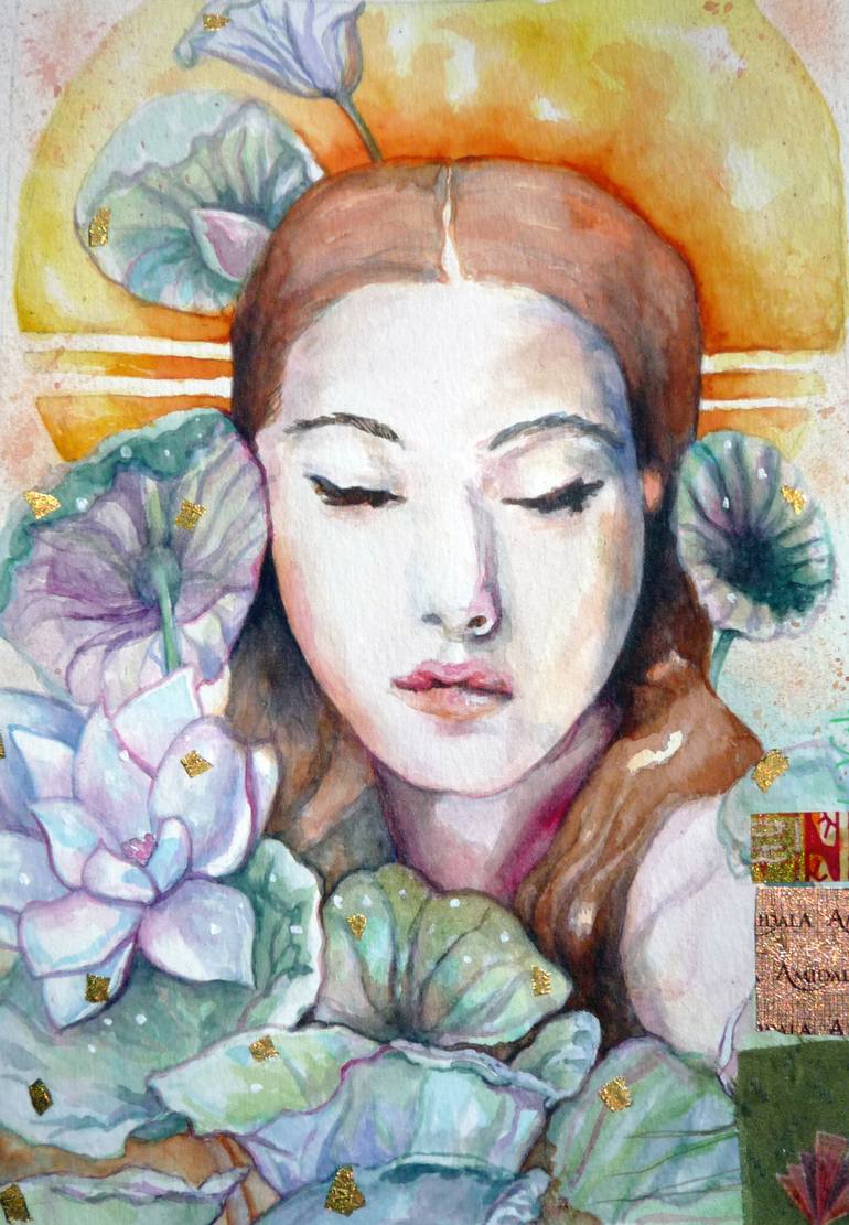 I'm a self taught and full time painter and life's lover. My work is composed of mixed media techniques on canvas, mostly painting and collages ( acrylics, oil, paper, fabric...). I seek harmony. Of the line, of the expression of my subject. I like playing with different textures, contrast between opacity and transparency, matt and glossy... Choice of colors plays a great part in this elaboration. The goal of my aproach is to suspend time, to slow down the present moment. As Henri David Thoreau wrote, « Life is too short to be in a hurry ». Taking the time to let enter onirism in the everyday life, serenity, a moment to free the imagination, to let the mind wander. As i am part french and part vietnamese, i am very inspired by asian culture. But also by great masters of the past, such as Klimt, Mucha, Gauguin, the impressionists, the preraphaelistes... And pieces of art more recent, even contemporary, often in the photography departement.