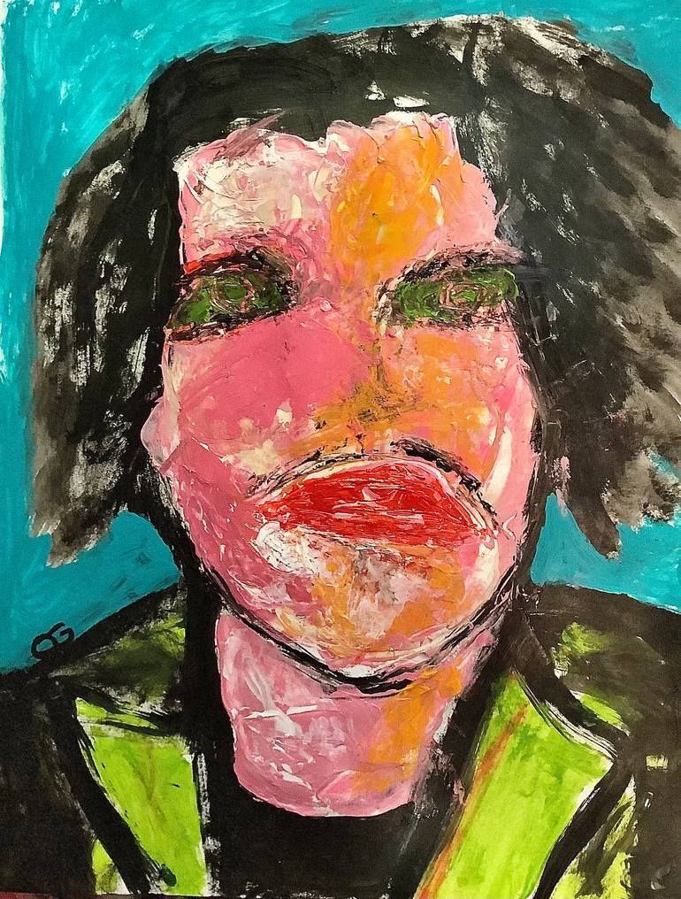 acrylic on acid free 98lb sketchbook paper Part of a series of abstract portrait paintings inspired by Latino culture & art brut. Signed on verso; initialed on front. Unframed.