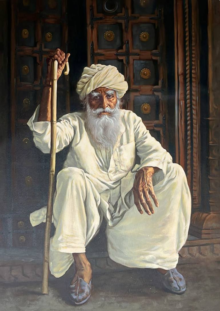 This painting is inspired by the wisdom, resilience, and presence of elders who have spent a lifetime watching over their homes, families, and traditions. The subject is more than just an old man he is a symbol of time, experience, and silent guardianship. His weathered face, steady posture, and tra...