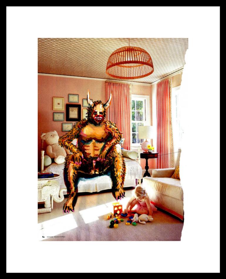 From the "House Beautiful" series. Figures are hand-painted (gouache) upon an actual magazine page. Hinged and floated within sumptuous 8-ply mat.
