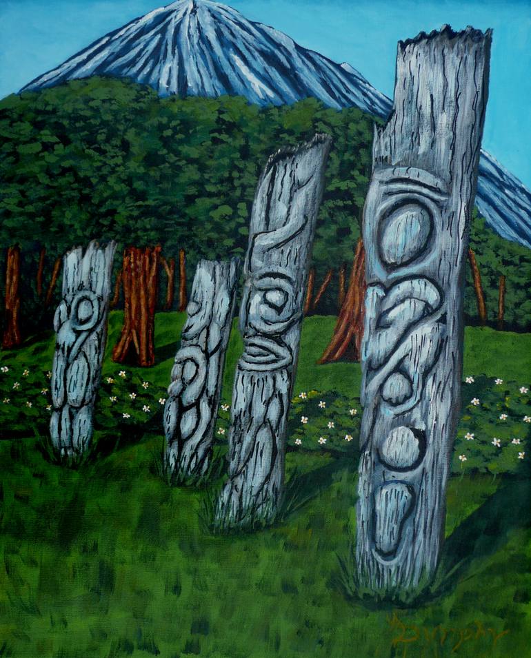 "Guardians of the Sun," is a stunning representation of ancient totems standing tall against the test of time. The vivid hues of the sun imbue the totems with a sense of warmth and protection, as if they are absorbing the sun's power to ward off evil. The intricate details and patterns on the totems...