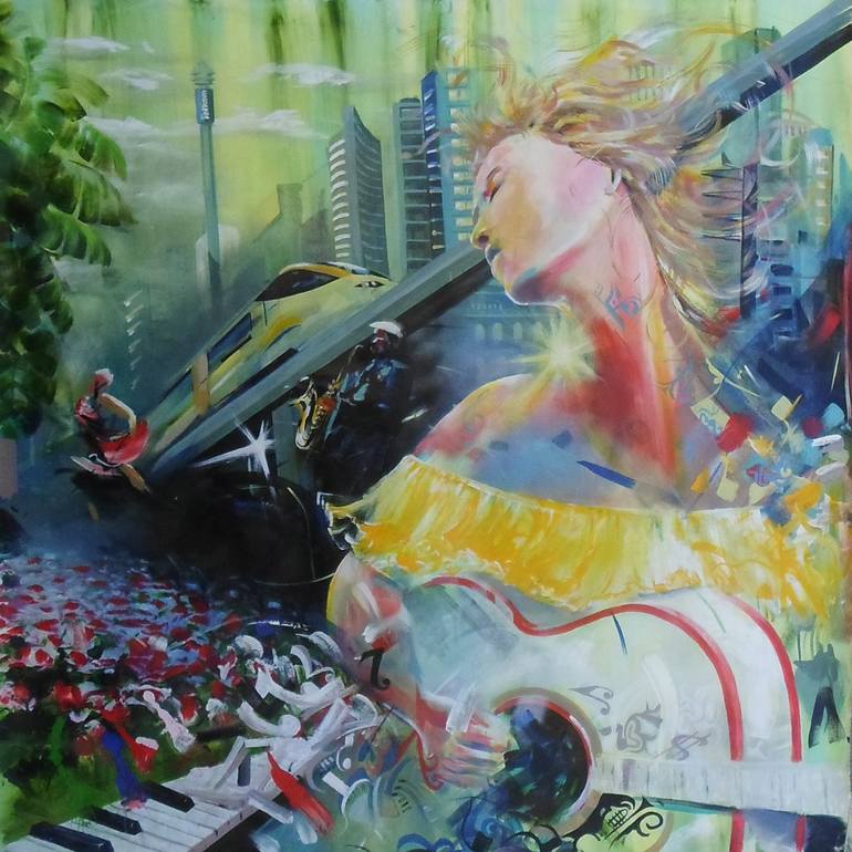 Mbongeni's work is inspired by music and dance, he captures motion, mood and the rhythm to engage the viewer into the beauty of his musical work. He considers his artwork as visual music and expresses his feelings musically on piece of canvas singing his songs with a paintbrush. The body of his work is largely figures, evolving from abstract images to recognisable elements using vibrant colours, texture and 3D effects.