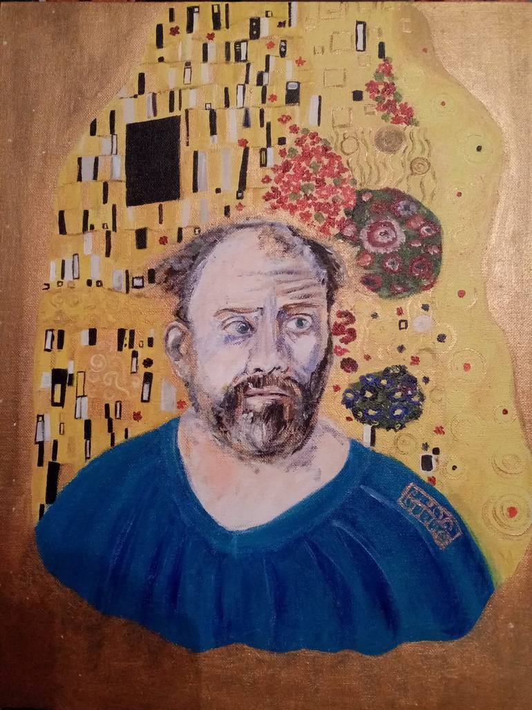 I was inspired by one of my favorite painters Gustav Klimt and his painting "The Kiss". I tried to use a color scheme that would capture the atmosphere I feel looking at his works. I wanted to make a combination of his portrait and motif from the painting "The Kiss"