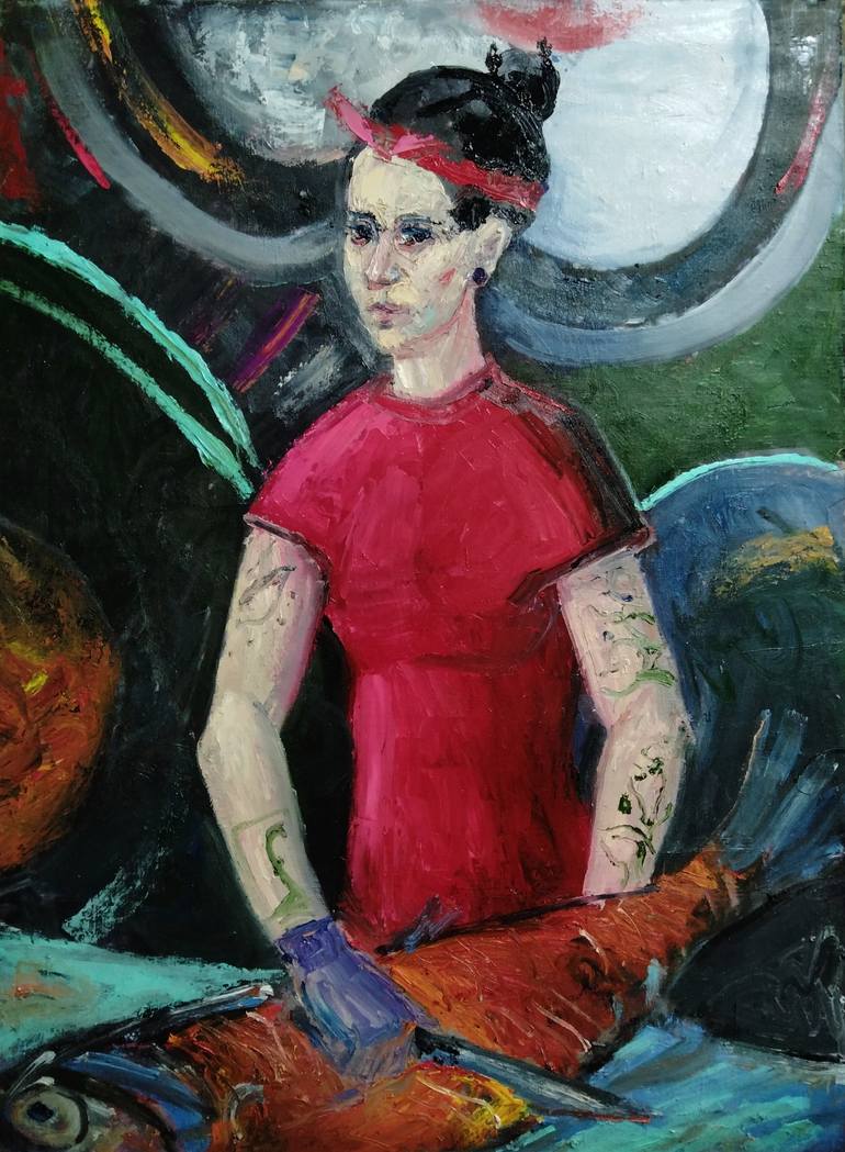 In creating this painting, I sought to capture the intense resolve and subtle melancholy that blend within the human spirit. The swirls of vibrant colors around the figure signify the turmoil and movement of life, contrasting with her poised, static posture. This juxtaposition invites the viewer to ...