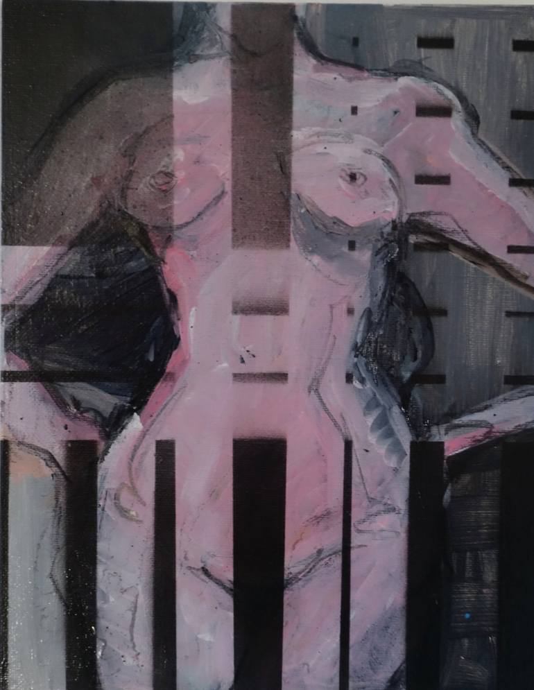 A small,hard cardboard covered with linen, ready to stand or to be hung on a wall. I have been trying to find harmony in this work between the 'classical nude and a modern composition. It reminded me of working just in front of the Elysée in Paris. (an area with a rich history and french couture)