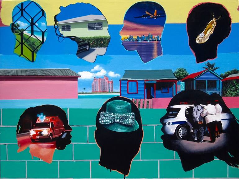 An unframed, acrylic painting on canvas, showing 7 silhouetted heads containing multiple versions of fantasy & reality superimposed over an ironic, caribbean landscape of meagre lifestyles & touristic excess.
