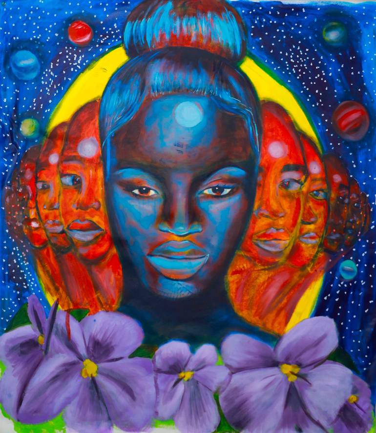 Her Ancestors Wildest Dreams is a piece depicting the bust of a young black woman covered in African Violets suspended in the universe. Her ancestors stand behind her and protect her.
