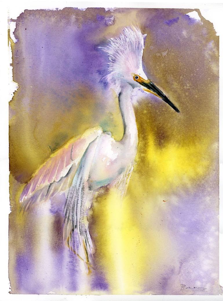 Heron painting - original watercolor. On the vibrant abstract background before you stands a stunning heron. In nature, this bird stands out even amidst a plethora of plants. I have painted it in a modern style, with a delicate white heron perched amongst the lively colors of the background.