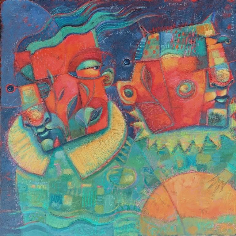 As far back as I can remember, I have drawn and painted faces. In fact, there is much evidence pointing to the fact that I spent an inordinate amount of time drawing Sister Mary Francis in 3rd Grade instead of paying attention to her in math class. All my paintings start out as tiny little sketches in my Moleskine sketchbook. I do tons of 2” thumbnail sketches every week, so when it’s studio time I always have plenty of starter ideas to work with. All of my paintings come from my imagination but I find plenty of inspiration in real life—it’s stranger than fiction! My most recent work is acrylic, collage and graphite and my color choices are mostly instinctual. I almost always start with complementary colors—I love the tension that occurs with colors that are opposites on the color wheel. In the final stages of a painting, I will try to repeat colors and I often use glazes to pull together a composition and create harmony. I always paint on black gessoed canvas—color is just so much more vibrant and rich than painting on a white surface. And the math that I daydreamed through in 3rd Grade now shows up in my paintings as “pretend equations” and symbols scratched into the backgrounds or drawn on top of the paint. Sister Mary Francis would be so proud.