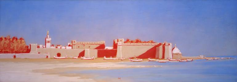 The walls of Hammamet, a Tunisian village, under the sun of a beautiful end of the day. The stone of the walls almost blends in with the sand of the beach. The sea water reflects the cloudless sky. Everything radiates the beautiful September light and the dazzling white highlights of the whitewashe...
