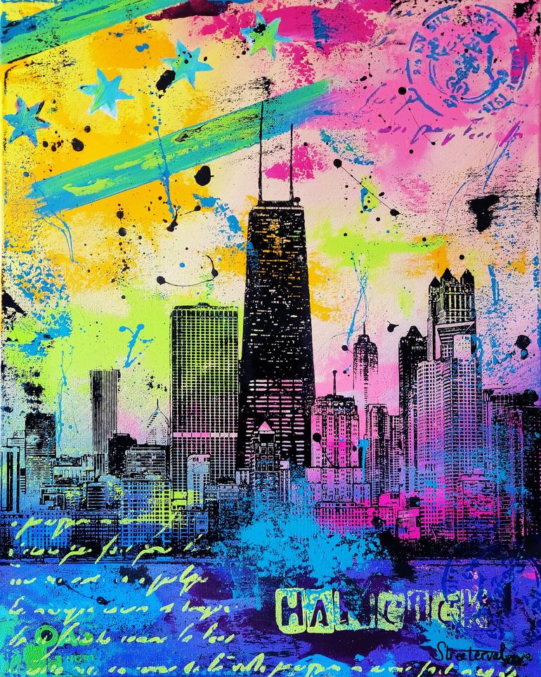 Cityscape of Chicago skyline with the Hancock building. Bold and vibrant colors with high energy.