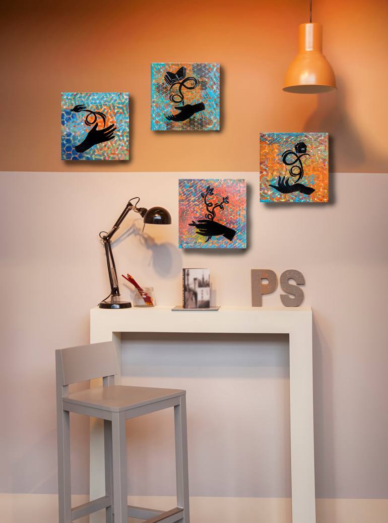 It's a Symbolic and Hopeful art This is 4 small acrylic artworks on framed canvas ( 20x20x2 cm) from the collection "Hands", decorative style, ready to hang, covered by heavy transparent acrylic gloss middle