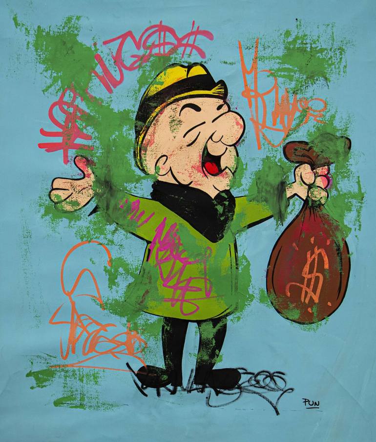 This painting of Mr. Magoo emerges as a symbol of triumph and prosperity. Set against a backdrop of urban graffiti, Mr. Magoo's delighted expression and uplifted arms exude an air of jubilation as he proudly displays a bag overflowing with riches and happiness. The graffiti tags adorning the behind...
