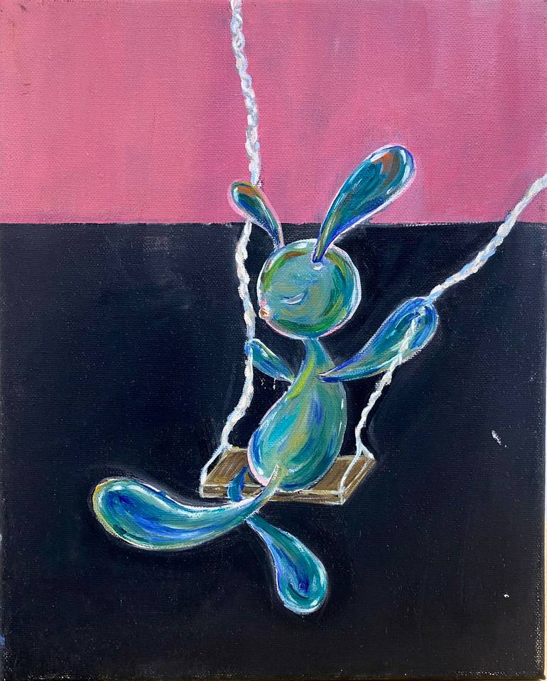 In this dark and shadowy scene, the rabbit-like figure is taking a ride on a swing This posture mirrors the feeling of being alone and lost, much like the times a child was playing alone. Now, after more then 20 years, as I look back at this image, I feel a deep connection with the lonely inner ch...