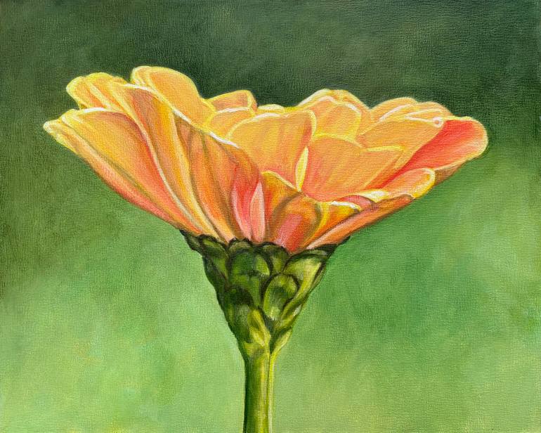 I was the youngest of four girls and I was the one who took up my dad’s offer to go with him to the nursery or help him in his workshop. My childhood memories smell like bags of manure in the back of the station wagon and sawdust on the floor of the garage. My dad taught me how to deadhead spent flowers and how to use a drill and how to temper steel. He gifted me with a miter box one year and a box full of acrylic paints and brushes another year. As an engineer he was a frustrated artist but one who could paint with plants and outfit a 27’ sailboat, sails and all. He filled our lives with beautiful things and those things have continued to be important to me as well, especially flowers. And he gave me that box of paints. From Yankee stock, my dad saved scraps of wood. There was a pile I could pilfer for whatever project I wanted. In middle school I used them to paint stylized characters of girls with long legs and flowers, always flowers. When I paint flowers now it’s as if I am gathering them together on the canvas as a gift for someone. I try to summon those childhood memories to imbue all of their essences together: their smell, their velvet petals, their brilliant color (not so much the manure). I like to paint them powerful and in-your-face, filling as much of the canvas as I can so the viewer gets a bee’s eye view. And sometimes I paint them in isolation, sometimes waifs, sometimes powerful in their solitude. I think about my work as autobiographical in some ways. The flowers, certainly, but also the infrequent landscapes which usually document a passage of time and space like a move across country. And in the past several years children have reappeared in my work. Now part of my own expanded family. Definitely marking the passage of time. My process is quite deliberate. I start with an inspiration photo that I take with my phone; do some tweaking of the image in Photoshop and then create a detailed to scale canvas-sized newsprint drawing outlining important elements which I then transfer to canvas. I isolate the subject by filling in the background with a dark color then work section by section painting thin layers to develop the various elements of the piece. I use a stay-wet palette so that I can work slowly to build thin color upon thin color. I will do several glazes near the end of the process. My last task is to complete the background, neatening errant brushwork, etc. I like short handled brushes and my rolling stool.