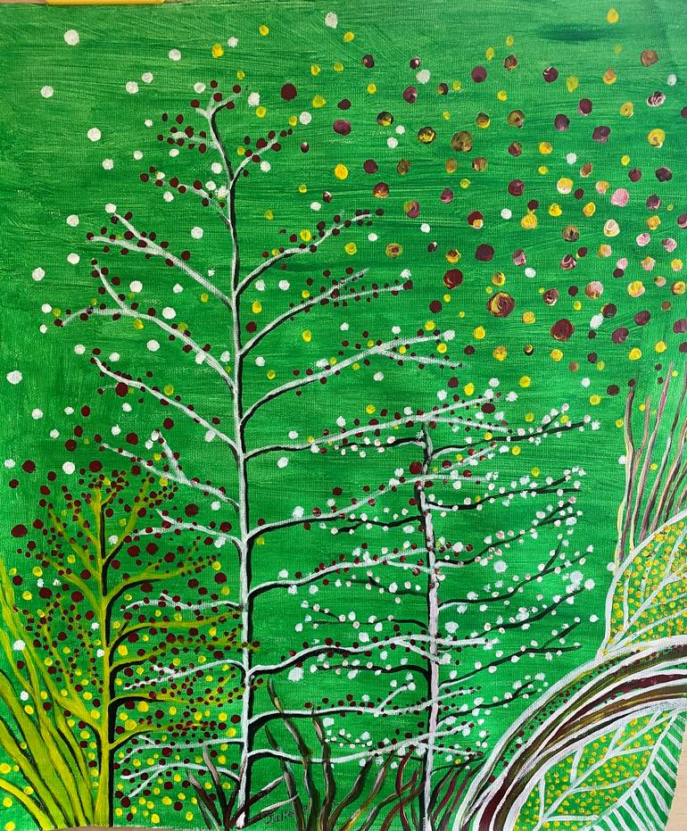 The green background cavas paper painting is perfect for wanting some bright color for the wall deco. The trees and woods depict peace and hope.