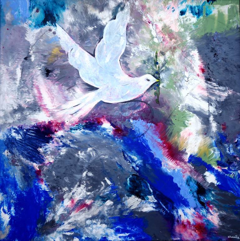 A white dove flying over the world, with an olive branch of peace. The world, today, is full of strife and greed. Yet, there is Nature, sending its gentle messenger, soaring into our hearts, encouraging peace, tolerance, love. Acrylic gives me freedom to work with vibrant colors and see fast result...