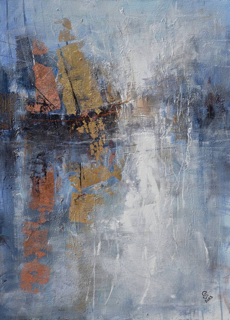 " Harbor of destroyed dreams - Blue Dawn ".....Painted with expressive moves.......with pallet knife and with a brush.....W 50 x H 70 cm I'm giving all best ,to be represent the true colors of the paintings in the photos, but sometimes you can see a little difference in tone.. I take good care packi...