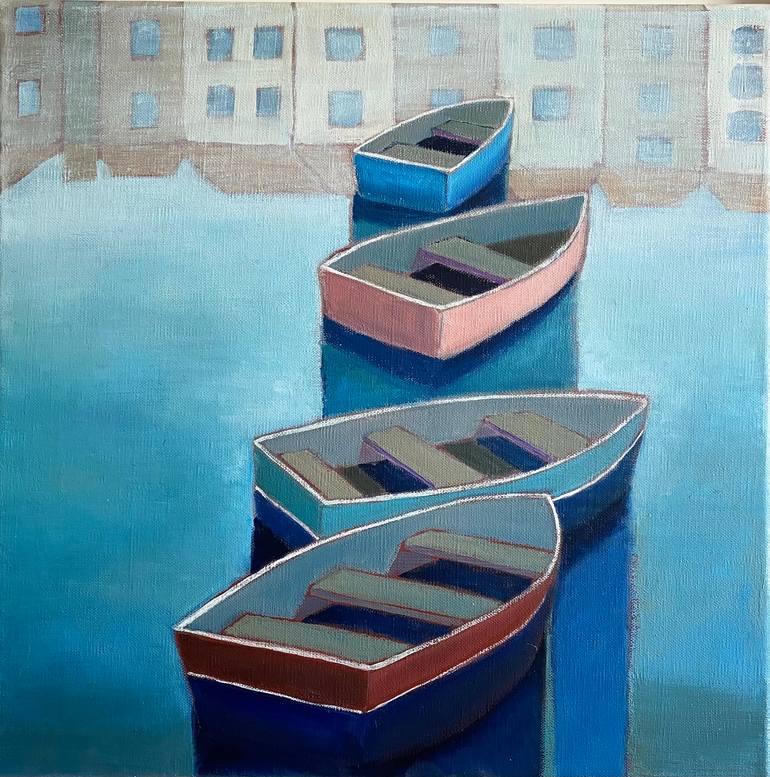 A view of boats moored in a harbour in Cornwall The boats and their reflections are semi abstracted and simply painted. Tonal colour relationships, texture and composition integrate the boats into the space or harbour.