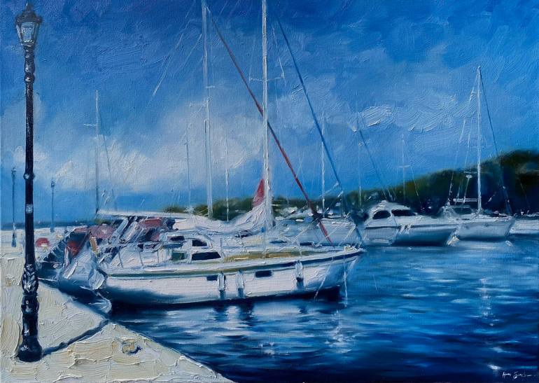 "Harbour" Original Oil painting on canvas 70x50 cm/27.5 x 19.6 inch Painted with brushes and palette knife on canvas. Original artwork, this is not a print or other type of copy. Highly safe packaging Signed and accompanied by a Certificate of Authenticity. 2021 Ready to hang