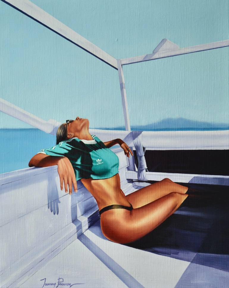 A woman travels between islands, soaking up the intense sun. A light-hearted image of modern travel. Painted on a fine textured, professionally stretched linen canvas, using Michael Harding artist quality oils and mediums and finished with a light satin varnish.