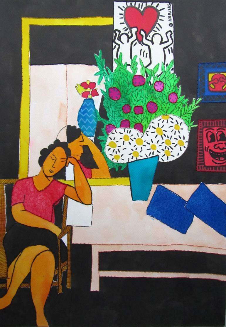 watercolor, ink, gouache, marker and thread on Fabriano 350 paper. This painting is part of my series inspired by Matisse. Here I adapt the environment to a contemporary space where Haring and Matisse would have known each other.