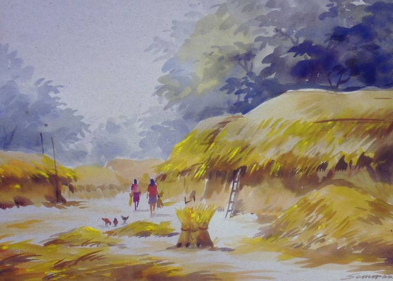 Harvest Time in Village is a Bengal Rural Landscape scene,Shipping with toll process.
