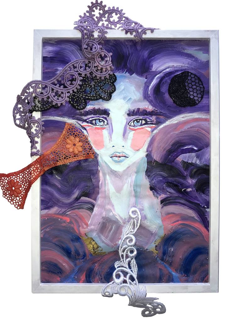 "Melusine" mystic inspired... Materials such as acrylics, watercolour are combined with floral lace ornaments which turns the picture almost into a 3D object. Mixed Media - acrylics, waterbed paint, lace fabric on paper Original Art - One of a kind Size: 20 x 30 x 1 cm, including white wood fra...