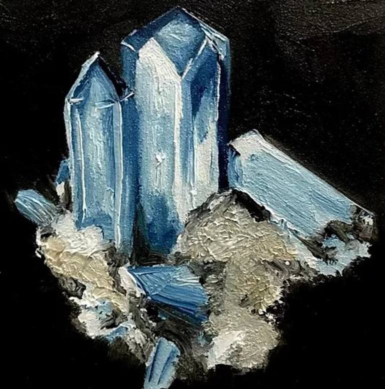 Oil on Gesso Board. The soft, calming greyish blues of Celestite are truly day dreamy. It's serene and delicate. It is believed that Celestite is a conduct of communication between angels and this physical realm. It soothes your sleep, allowing you to enter the mellowest of dreams.