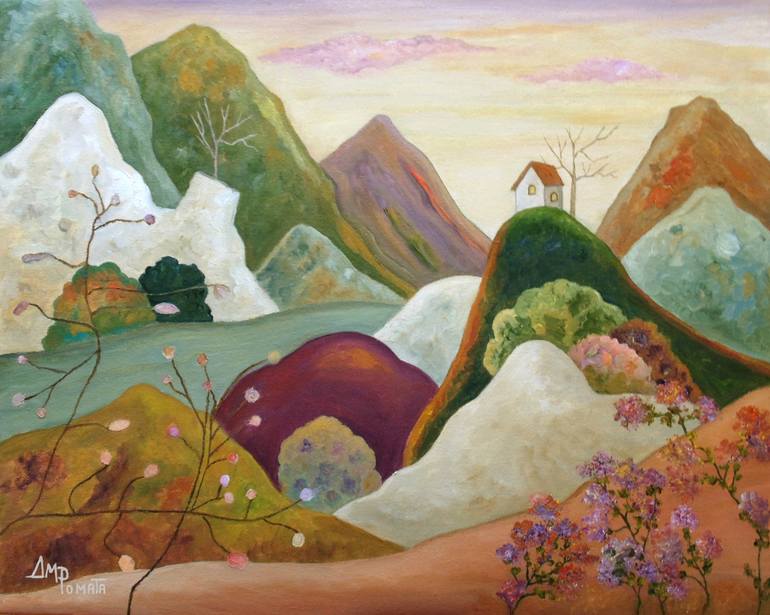 A whimsical landscape features rolling hills with vibrant colors and a small house perched on one of the peaks. Delicate flowering branches and abstract forms create a dreamy, imaginative scene.