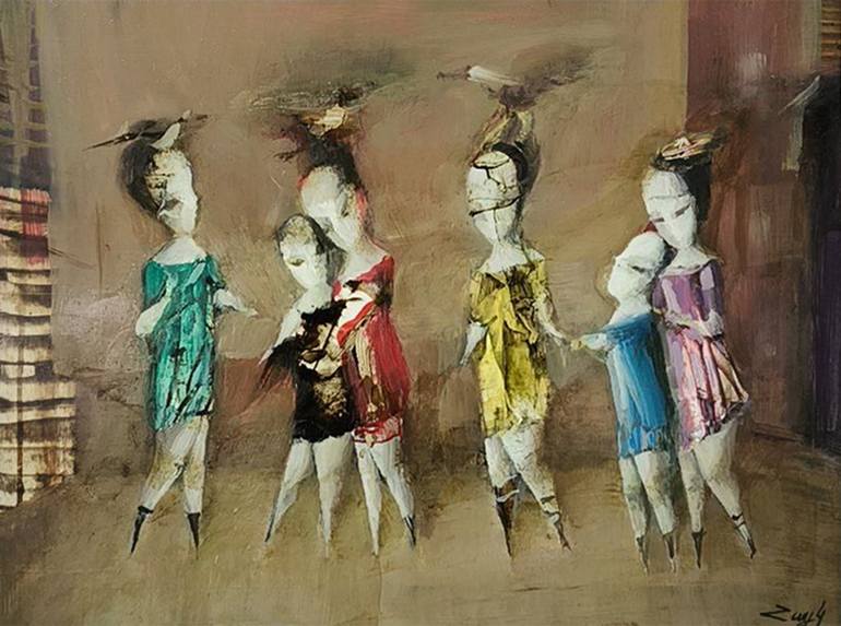 OIL/PAPER Size - 35x45cm Original painting, 100% hand painted on paper. Come with signed certificate of authenticity This evocative painting captures a surreal scene of faceless figures, their forms fading into the muted, abstract background. Dressed in vivid yet subdued tones of green, red, yello...