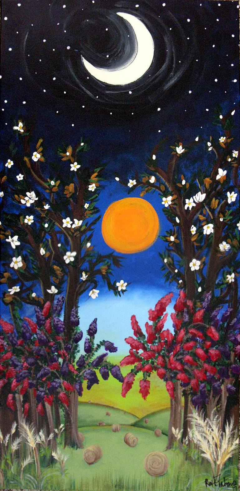 A wonderful original piece I simply call "Hayrolls". It is inspired by my new rural home and combines natural elements in an abstract composition. The moon and sun smile down on the rolling hills of a pastoral farm. Beneath are the blooming magnolia trees and crepe & mirtle trees. Peaceful ...