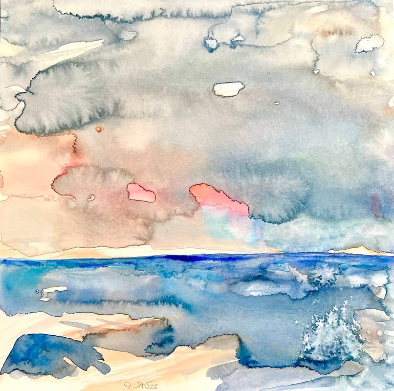This painting is all about summer vibes, beach life, enjoying life when it is warm and enjoying the refreshing sea.... or longing to be there! Watermarks and lines, scratches and other watercolor effects are important to my work and keep fascinating me. Watercolor and silver sparkling pigments on ...