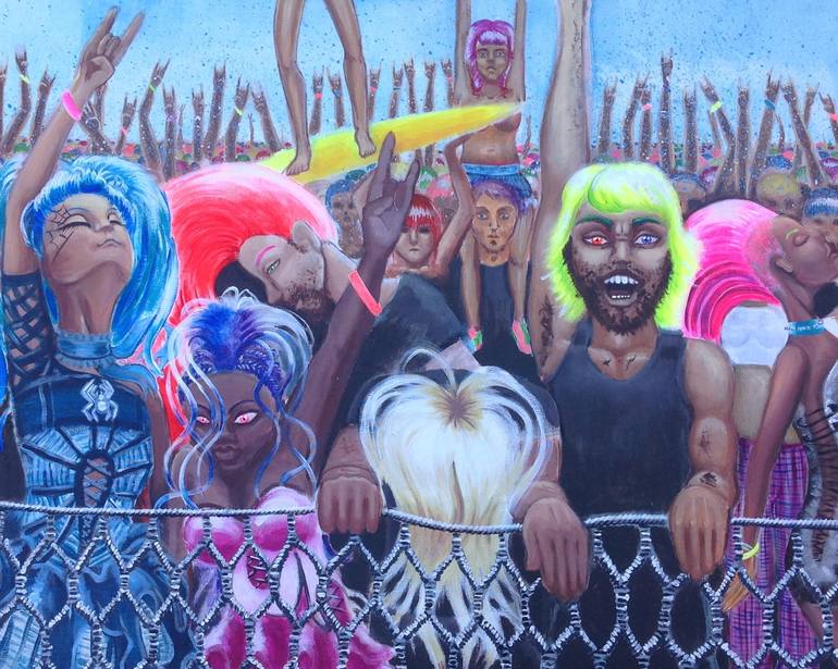 This is a land scape of human body's of the late 90s and early 2000s. while some people liked Paris Hilton, Britney Spears and emmenm. Others were loving music from multiple eras, dying their hair with fudge, and learning an electric instrument or dubble kick drum set. This painting is like a window...