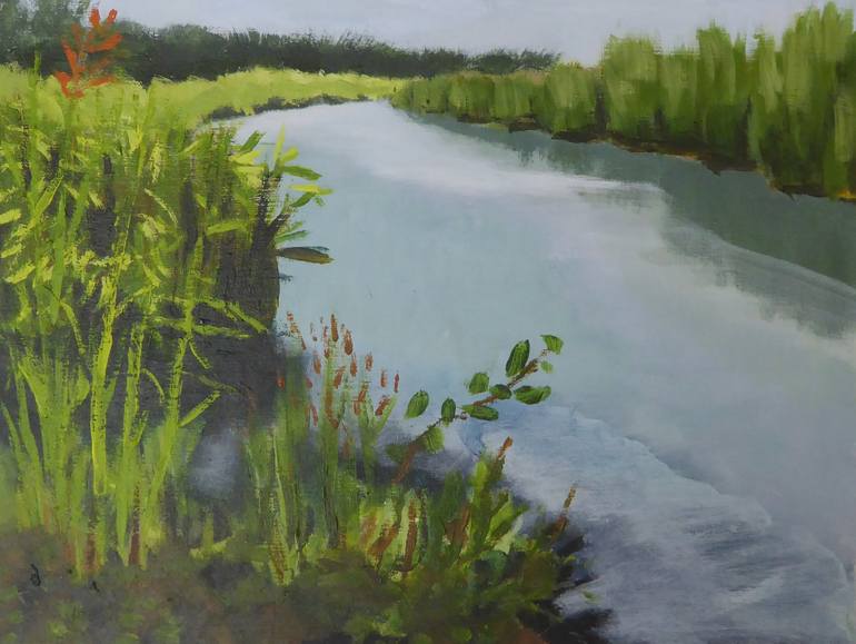 Here we are at the side of the river. Soft sounds of birds in the reed. A fine place on a fine day in summer. This painting comes wired and framed. So when it comes, it is ready to hang on the wall. The frame is a wooden canvas floater frame in the color eggwhite.