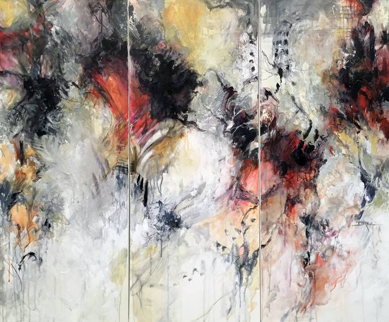 Heart Strings, is a 3 panel piece, triptych. Inspired by a floral arrangement about love. Using the colours in the arrangement, and the natural movement in the mark making. My aim was to create a beautiful, flowing motion. Like heart shaped balloons floating upwards.