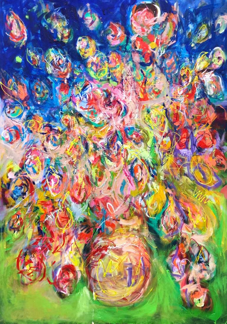 In this vibrant masterpiece, the canvas comes alive with a kaleidoscope of colors and shapes, reminiscent of a bustling garden in full bloom. Each brushstroke seems to dance with the exuberance of spring, as if capturing the very essence of nature's jubilant symphony. At the heart of the compositio...