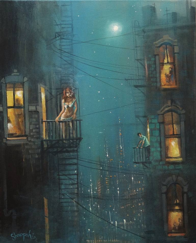 Heat Wave It's a humid night in the city and too hot to sleep in the old tenement. Out on the fire escape there is a chance of a slight breath of air. The woman has a smoke and has no concern for modesty as she tries to escape the heat. A neighbor enjoys the view.