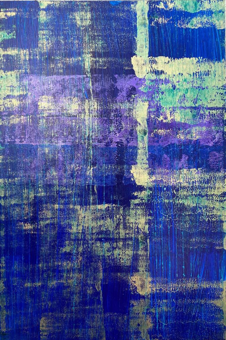Deep blues and purples, golds and green golds layered and textured and patterned. There is an aura, a spirit that emanates from deep within this painting. Custom-built hardwood frame painted a deep blue-gray glittering subtly with mica flecks. Signature, title, date and artist inventory number on t...