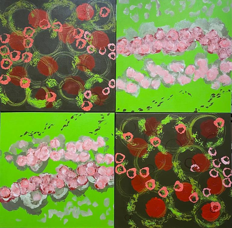 Followers know I work with two themes based on travels to Iceland (Aurora Borealis) and Namibia (fairy circles ). Here I combine the themes using 4 square canvases that can be rearranged.