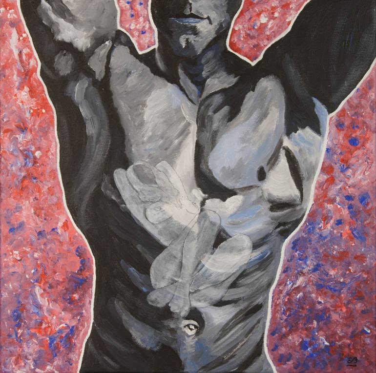 Male nude torso, with a woman body inside. Acrylic painting, on canvas, on a stretching frame, with frame 53 x 53 x 3 cm.