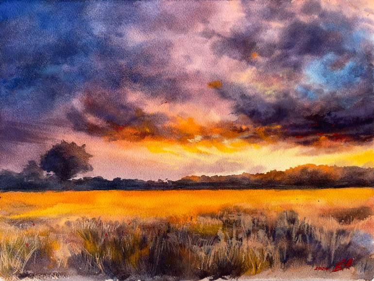 I paint this artwork when was at train. I was invited to the factory of ukranian watercolour, oil Rosa. I was inspired of landscapes I saw from the window . I like landscapes, I like clouds and I love sunsets Original field watercolor painting drawn from Artist . Hand-painted artwork. It is in a s...