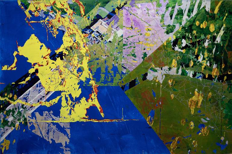 This image is based on Hells Gate area in the East River. My work is derived from satellite images and maps. Many of my paintings focus on the waterways that surround Manhattan and the Hudson River.