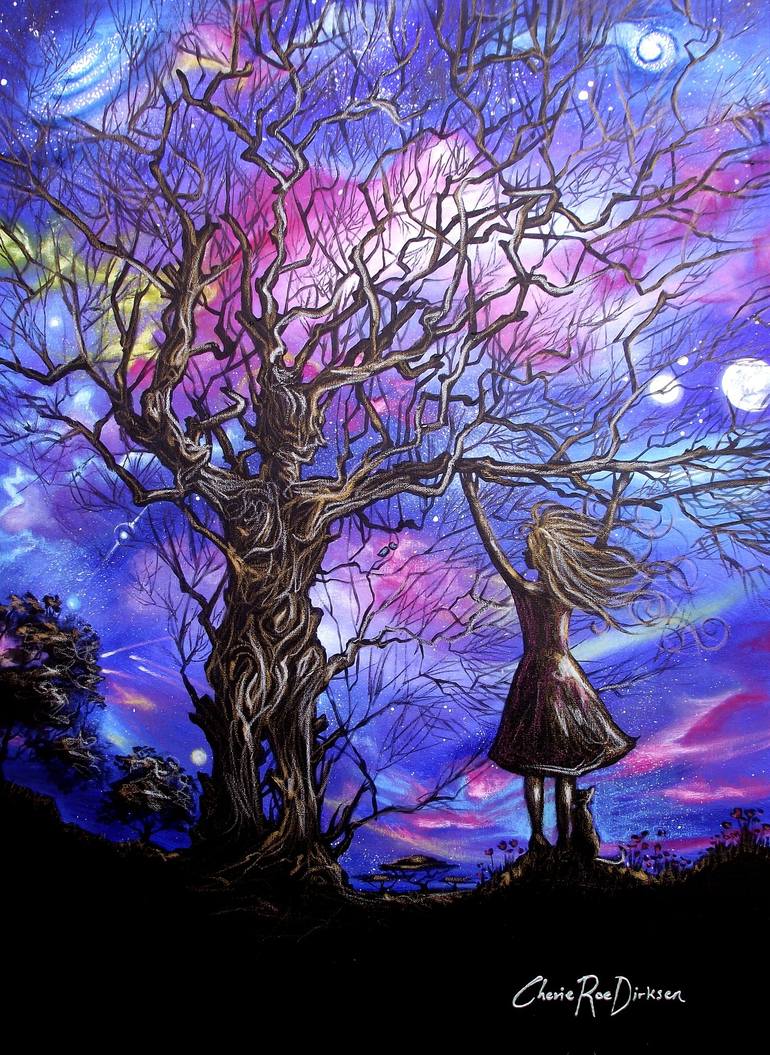Inspiration behind the piece: A young girl stands silhouetted against the unfolding universe. She's holding onto the branch (arm) of a tree shaped like a man. He symbolizes the divine masculine energy — supporting, strong and dependable. She symbolizes being at one with the stars, galaxies and...