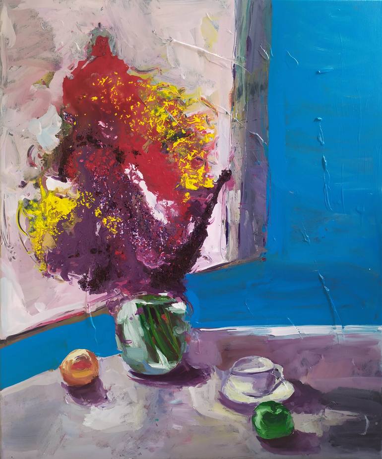 Sometimes, it’s nice to kick back in a comfortable chair, grab a cup of coffee, and enjoy the sights around you. It’s especially true with this light and colorful acrylic painting in your home. A lone pot of red,purple and yellow flowers sits atop a pleasing blue surface, joined by a full cup of hot...