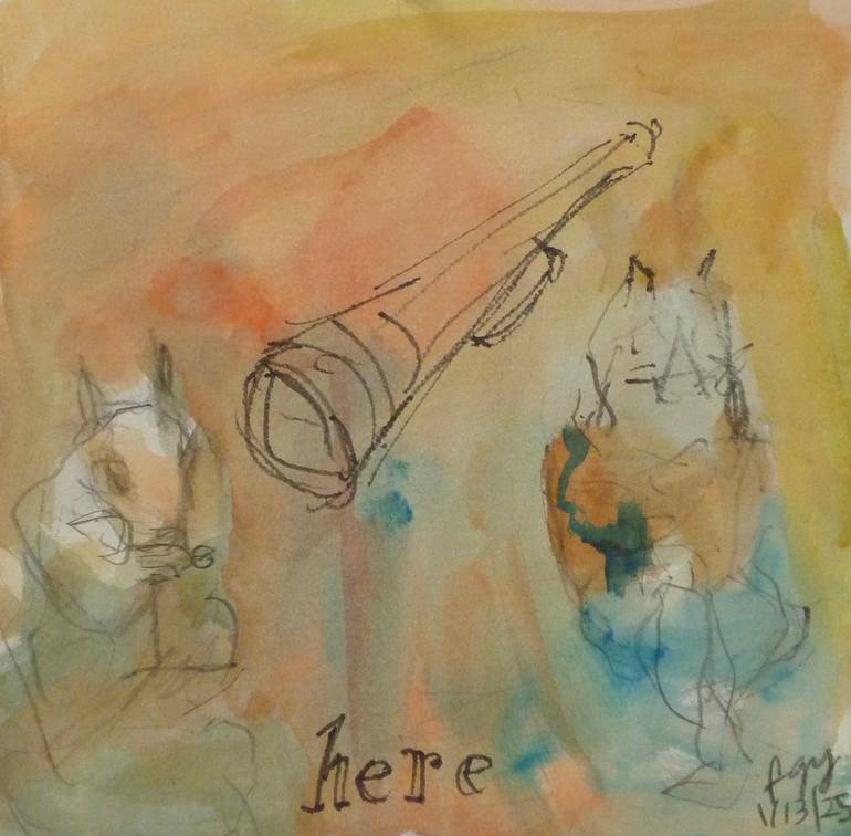 I like to put odd things together to create new ideas or thoughts. I use different words and images together. This is fun for me. In this painting on paper, I used a couple of images (horn illustration and squirrels from a photo) and a word (here) to make a whole new environment.