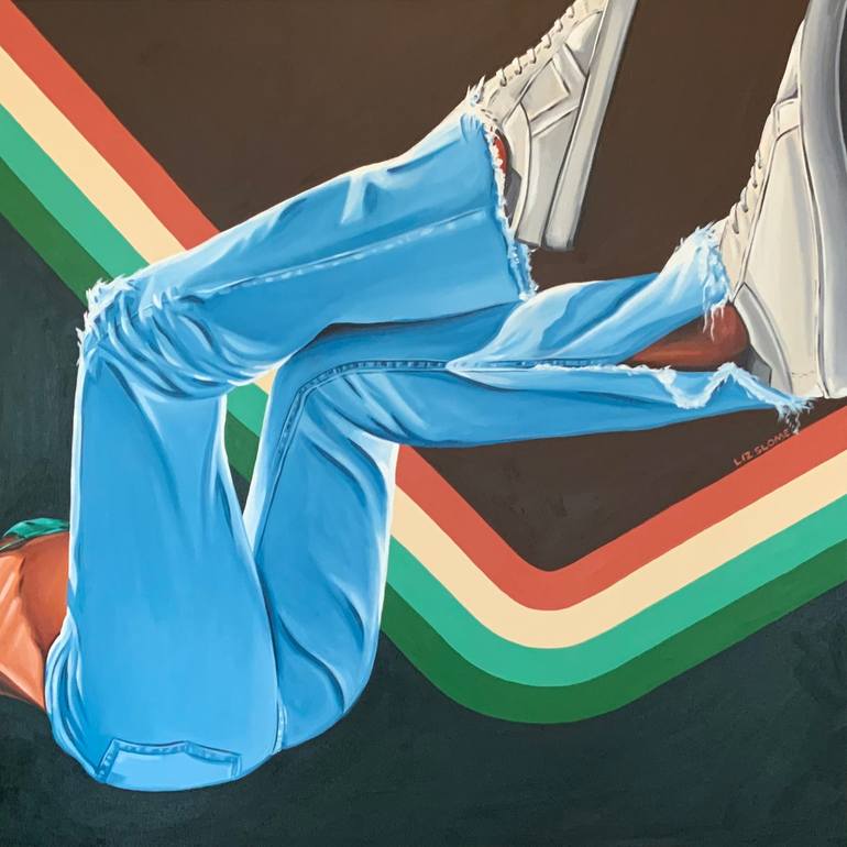 Handmade wooden frame. Woman laying on the ground with frayed jeans. Green, beige, orange and brown background.