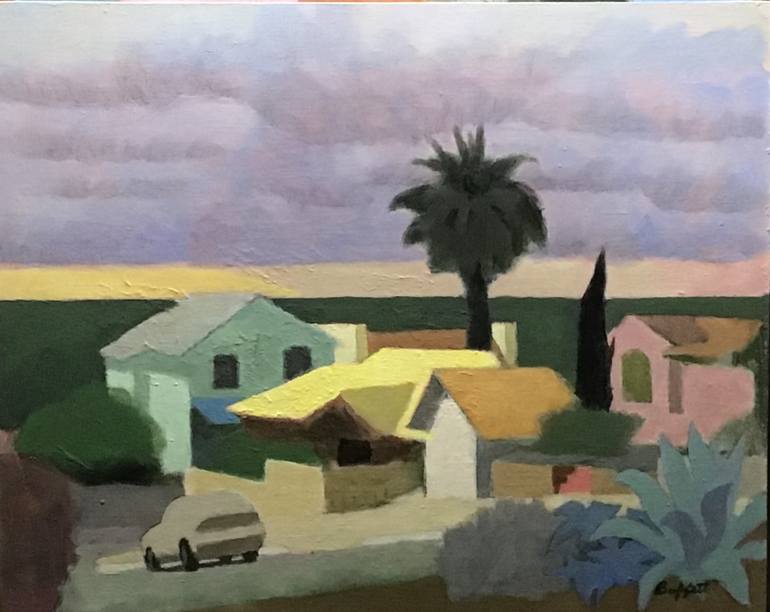 Eye-catching composition of small residential homes by the Pacific. Feeling of harmony, quiet and warmth. Painted on a hardboard panel, the picture is NOT ready to hang. French author Bernard Dato has written about this painting. His remarks in French are followed by a translation. Comme toujour...