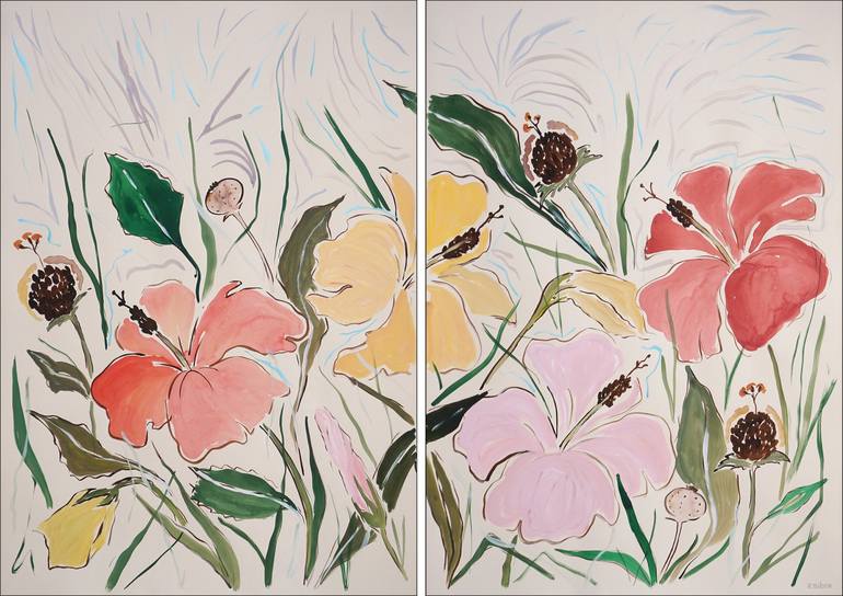 "Hibiscus Oasis IV" is an abstract expressionist painting by Romina Milano where a dance of blue gestures unfolds across colorful brushstrokes infused with raw emotion. Romina Milano is an Italian artist renowned for her paintings that are primarily composed of strong gestures, vibrant colors, and...