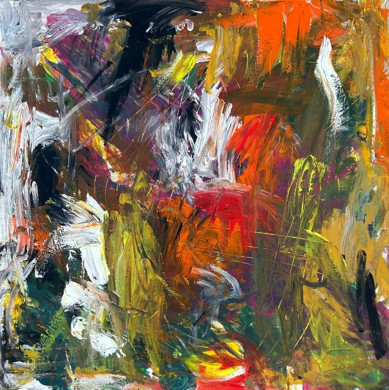 ‘Hidden Desires’ is a symphony of color and emotion, where passion and mystery intertwine. Layers of vibrant reds, oranges, yellows, and deep greens dance across the canvas, each stroke whispering untold secrets. The abstract forms, shaped by energetic and deliberate movements, conceal stories of lo...